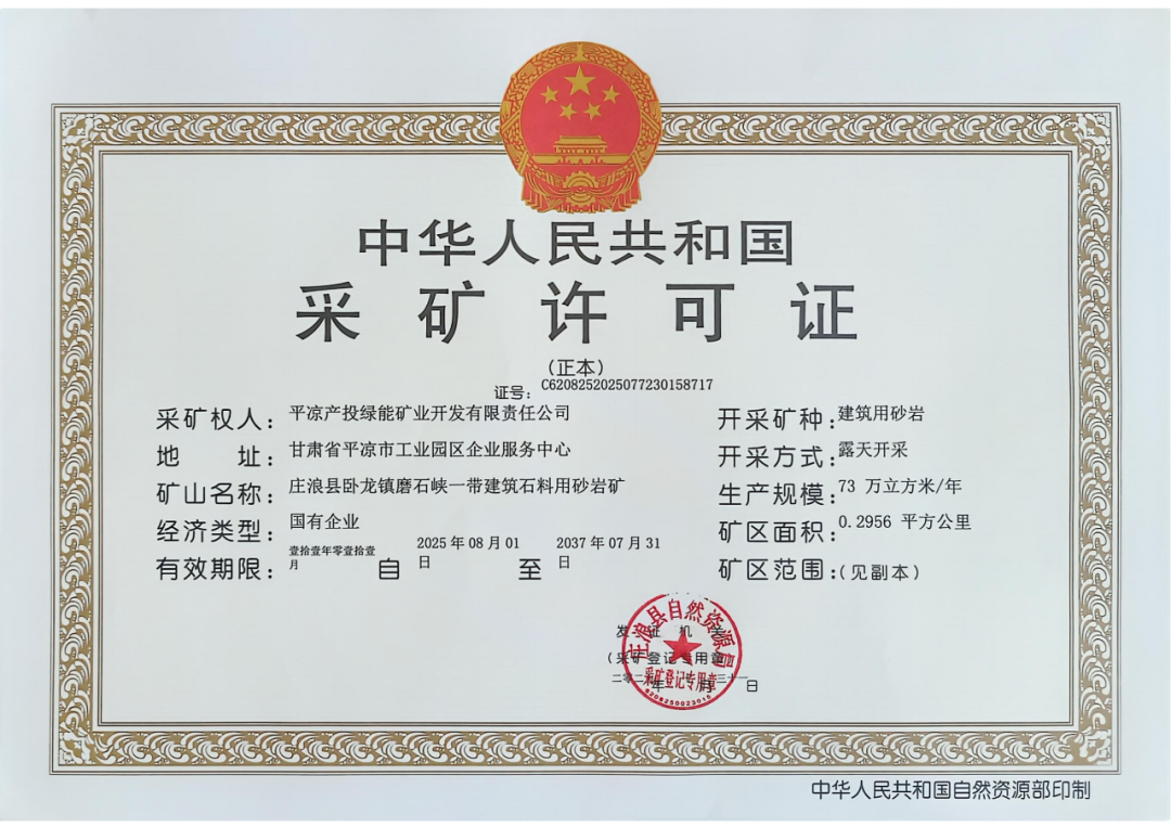 喜报丨市产投集团绿能矿业公司取得庄浪县卧龙镇磨石峡一带建筑石料用砂岩首采区采