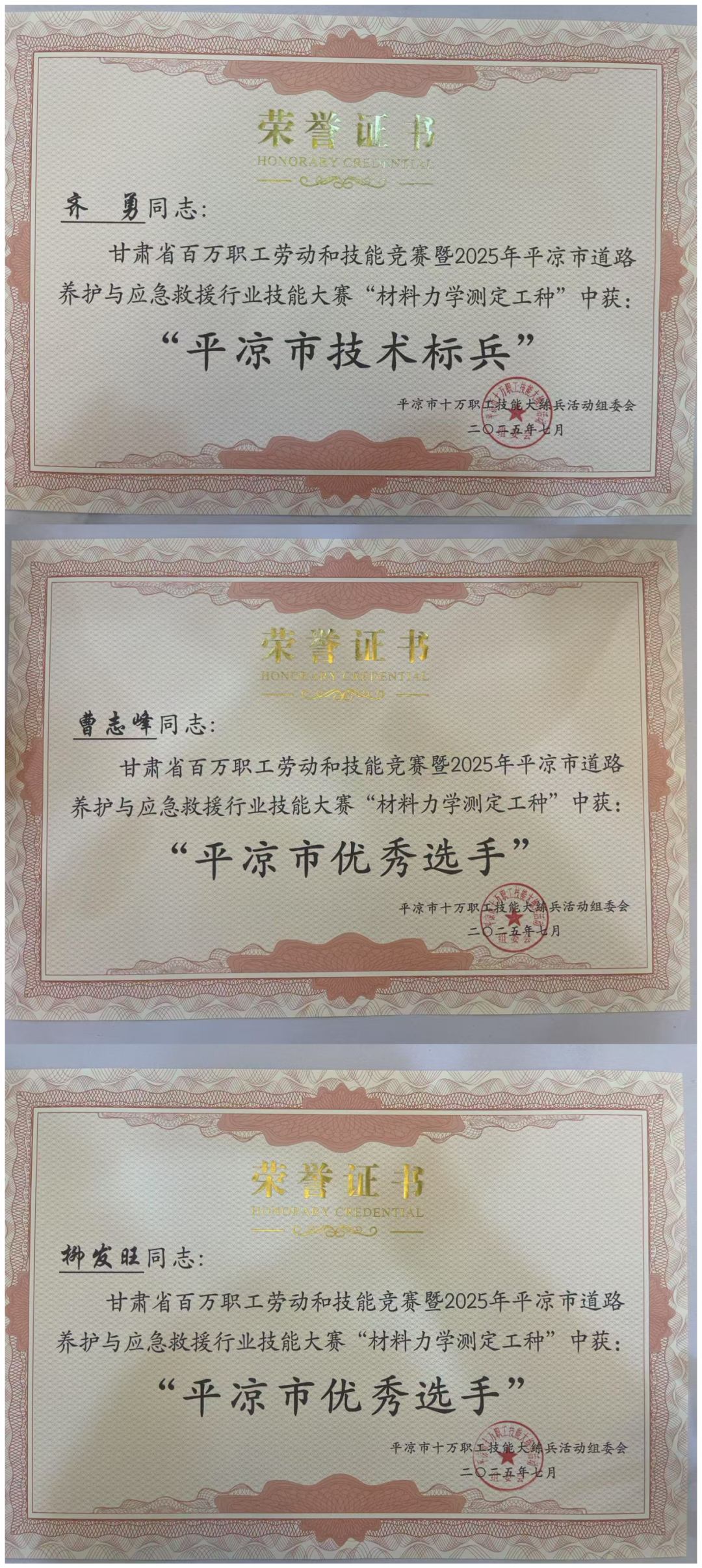 2025-08-04近日,甘肃省百万职工劳动和技能竞赛暨2025年平凉市道路养护与应急救援行业技能大赛圆满落幕。在这场技术人员激烈角逐中,平凉市泾东水利水电勘测设计有限责任公司的三名员工凭借精湛的专业技能与稳定的赛场发挥脱颖而出,分别荣获“平凉市技术标兵”和“平凉市优秀